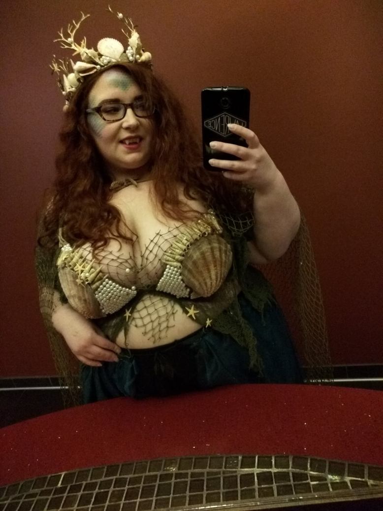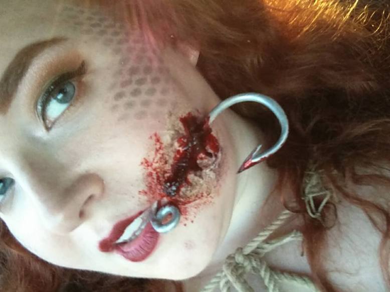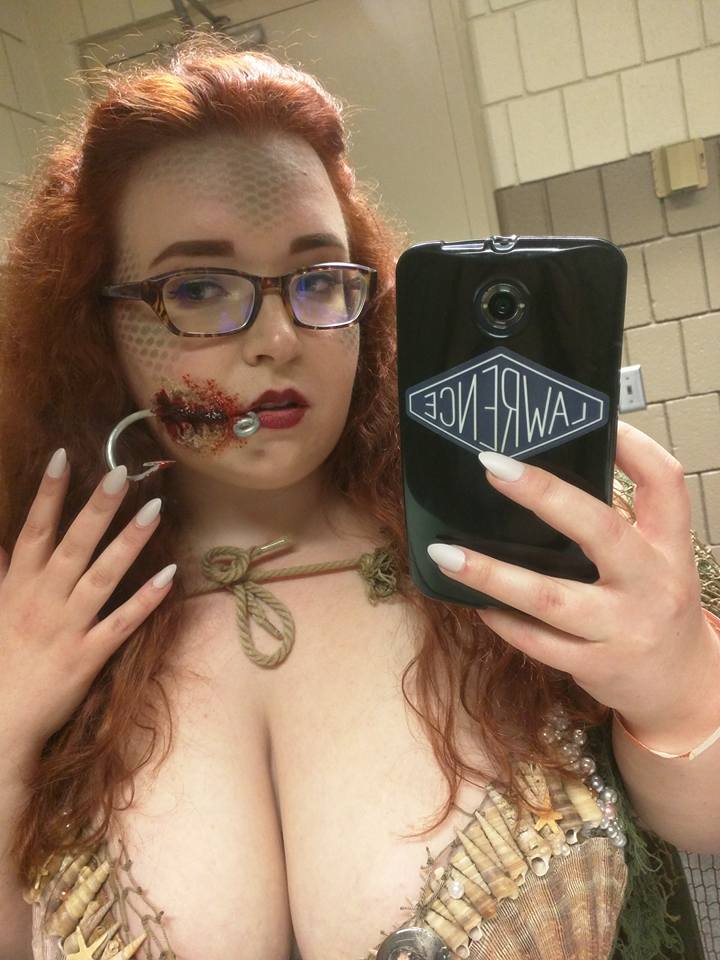 Fast forward another two months. Alison wants to go to Crypticon. I want to go to Crypticon. Alison is going with a really cool Mad Max group. I have no costume. And who wants to be the only one not in costume at an event like this? So. Back to the drawing board I went with my siren. I repaired the bra (again), upgraded the beading, and made a super luxe skirt that I actually sorta love but failed to get a picture of. BOOM. Siren Vol. 3. Oh, and I shoved a fish hook through my face! Kidding. I sculpted a fish hook out of Sculpey III clay, painted it with silver acrylics, and glued it down with latex and toilet paper. And away we went!