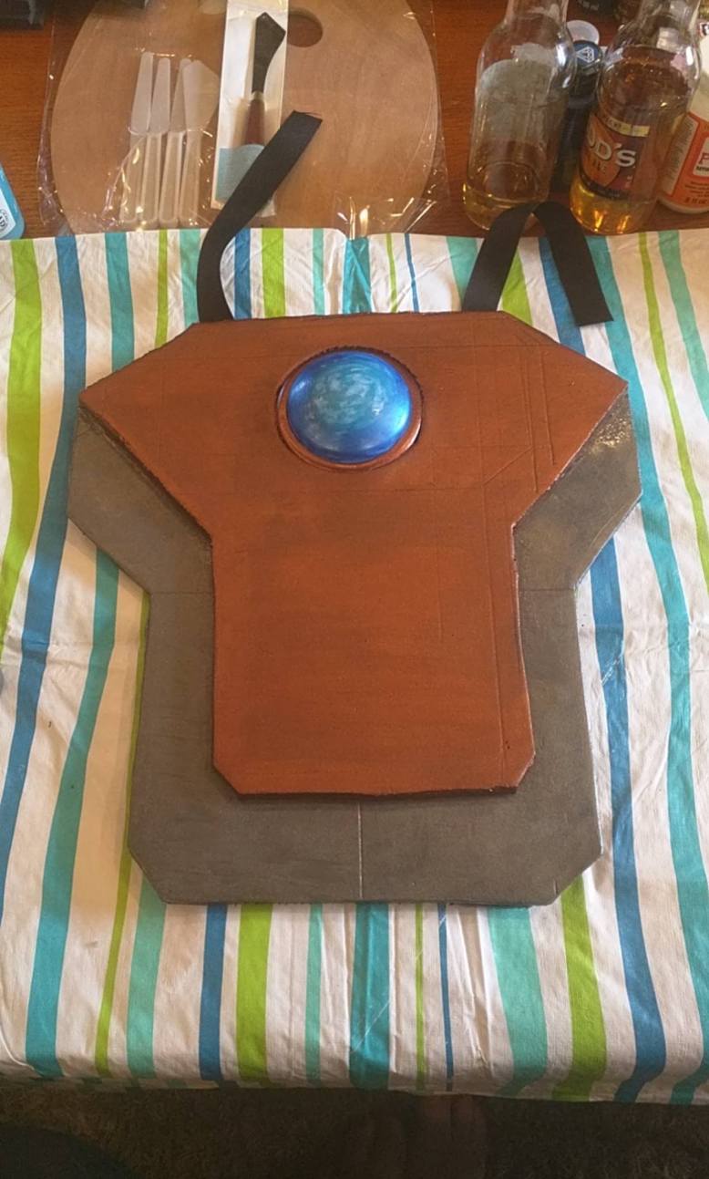 The back piece was the easiest thing to build. It’s two flat pieces of EVA foam, cut to shape and size, with a hole carved out in the middle for a $1.50 closet “tap light” to be glued. I painted the light a semi-gradient blue, added hole-punched foam rivets, and slapped some coordinating paint on the whole thing. Add in parachute strapping for the piece to harness onto and I was done!