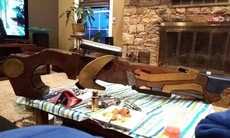 I recognize now that I should have taken better progress photos, but I was a distraught mess at practically every step of this build. That’s more or less the final form of the gun. I added more coats to various parts and sealed the whole thing with a shiny spray varnish and Mod Podge. Next was finishing the costume itself and building Rocket’s back piece.