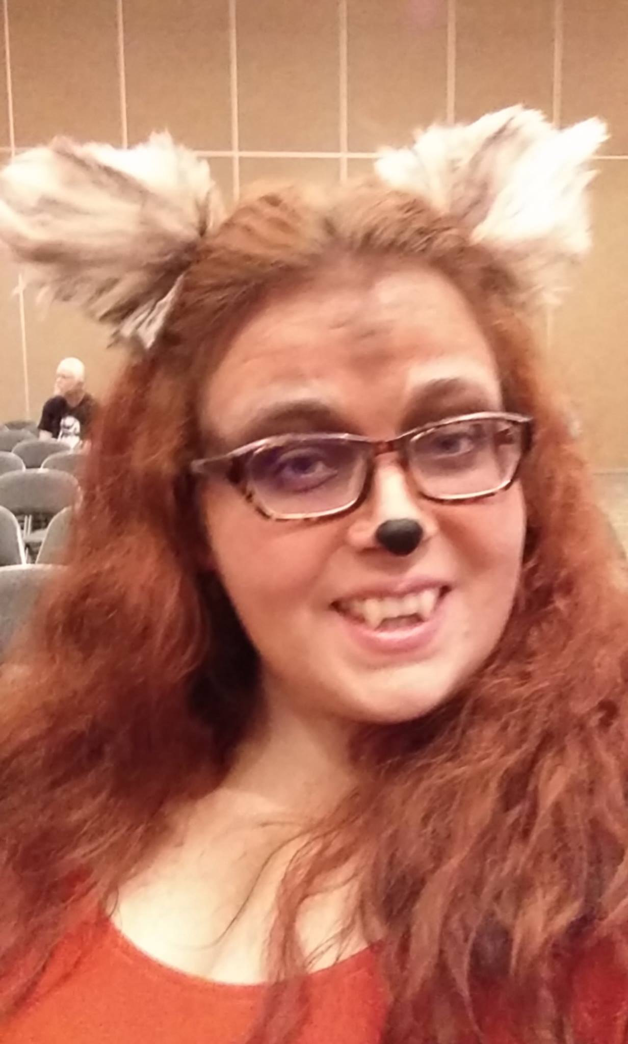 The first thing I made for this costume was actually the tail, which was tufts of multicolored yarn that had been brushed into silky smooth submission with the aid of a spiky metal dog brush. I used the same process to make ears, which I attached to felt backing and hair combs. Now that the props had been constructed, all that was left to do was finish creating the skirt and altering the leotard to better fit my vision. Naturally, that meant I was up sewing panels on to the leotard at 7am the day of the cosplay’s debut at O-Comic-Con in Council Bluffs, Iowa. But I got it done and here we are!